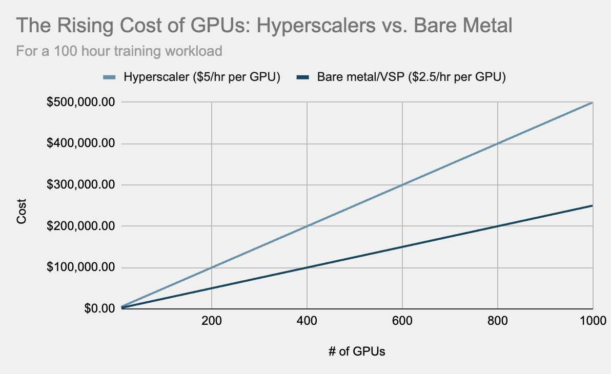 Where a hyperscaler might charge $4–$5/hour for an H100, a bare metal provider could come in at half that cost — or less. For a startup training large models or running continuous experiments, this translates into months of extra runway. Every saved dollar buys more iterations, more features, and more chances to hit product-market fit. The chart below illustrates that as GPU counts scale from 10 to 1,000, total costs rise sharply on hyperscalers, while bare metal grows at a more gradual pace.
