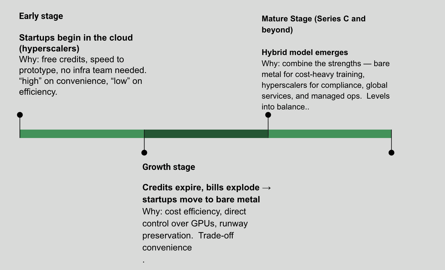 The choice between hyperscalers and bare metal isn’t static — it evolves as a startup grows. Each stage of the journey brings new pressures, and with them, different infrastructure priorities.