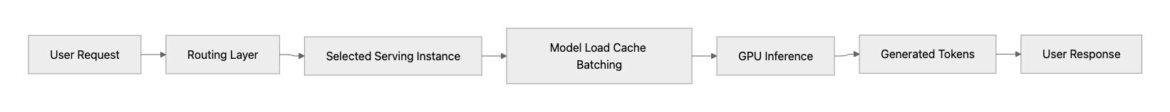 The following diagram shows the online execution path for a single inference request. The routing layer first selects the best serving instance, then the serving runtime performs model execution steps such as model state access, cache use, and batching before running inference on the GPU. The output tokens are streamed back as the user response. The key point is that routing decides placement, while serving performs GPU execution.