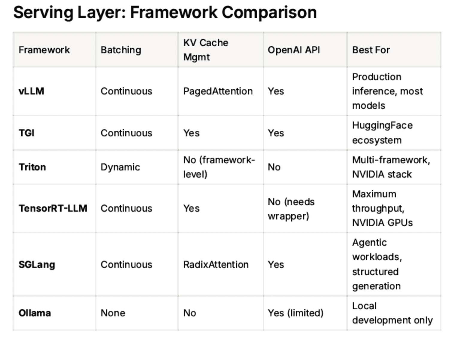 Serving | vLLM, TGI, Triton, TensorRT-LLM | High — manages GPU, batching, KV cache |