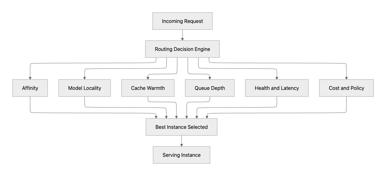 The following diagram demonstrates the routing decision logic. It shows how modern routing is a placement decision engine, not simple round-robin load balancing. For each request, routing evaluates multiple signals such as affinity, model locality, cache warmth, queue depth, health/latency, and policy constraints, then selects the best instance. This improves both user-facing performance and fleet efficiency by matching each request to the most suitable serving target.