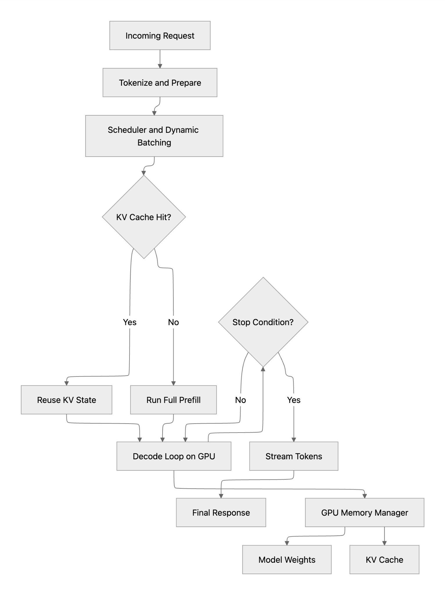 The following diagram shows the serving-layer execution path for a single inference request. After tokenization and batching, the runtime checks whether a reusable KV cache state exists: on a cache hit, it can bypass most prefill work and move quickly into decode; on a cache miss, it must run full prefill before decoding tokens on GPU. Both paths converge at the decode loop, which continues until a stop condition is met and tokens are streamed back to the user. The key takeaway is that serving performance is driven by batching efficiency, cache hit rate, and GPU memory management, all inside the serving layer itself.