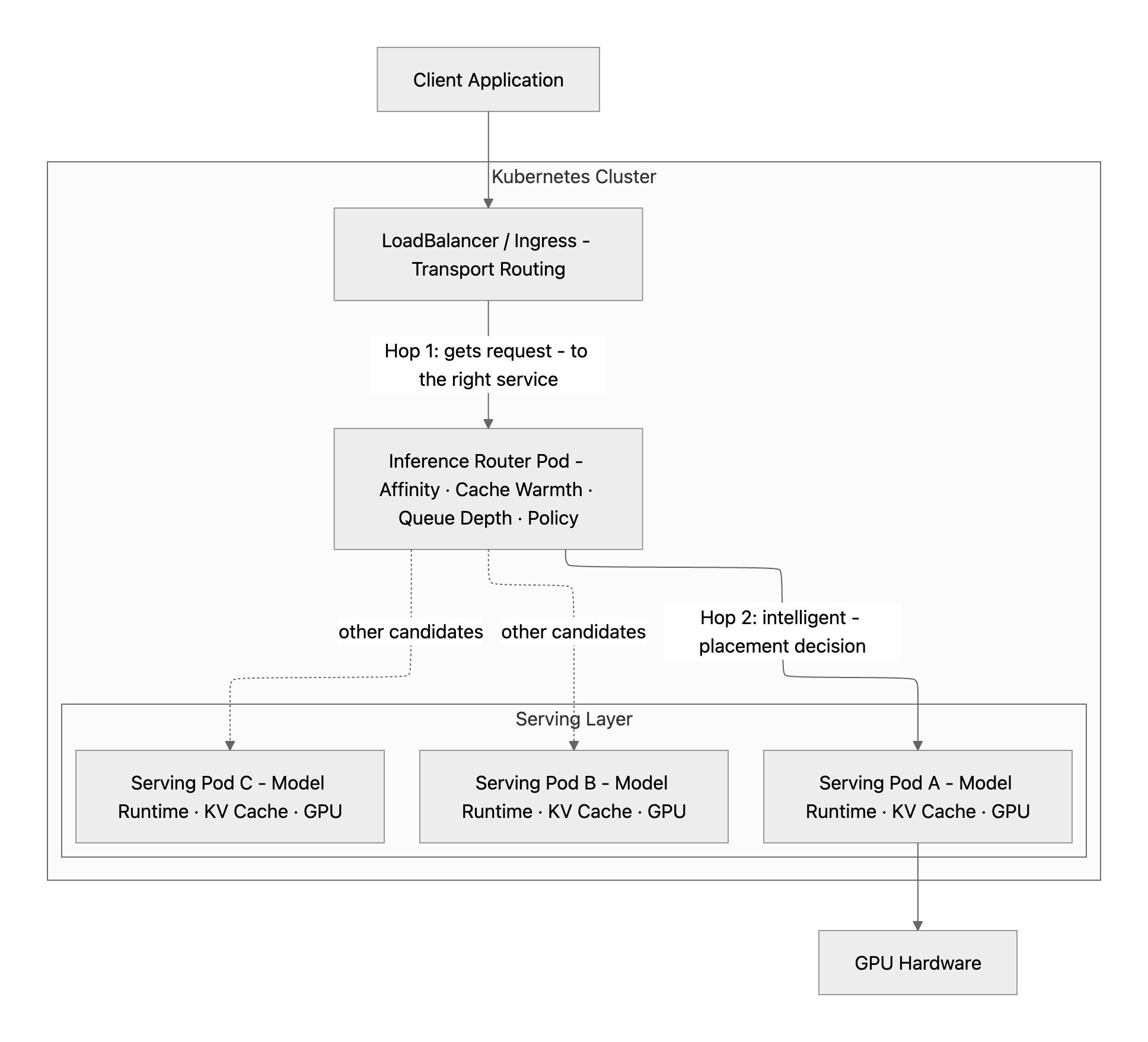 Every inference request travels two distinct hops inside the cluster. Kubernetes handles the first: a LoadBalancer or Ingress takes the request and delivers it to the inference router pod — standard transport, no intelligence. The router handles the second: it evaluates affinity, cache warmth, queue depth, health, and cost policy, then forwards directly to a specific serving pod, bypassing Kubernetes' default round-robin entirely. Inside that pod, the serving layer takes over — batching the request, checking for a KV cache hit, running prefill or reusing cached state, and executing the decode loop on GPU. The stack has a clear division of responsibility: Kubernetes moves bytes reliably, the router places work intelligently, and the serving layer executes it efficiently.