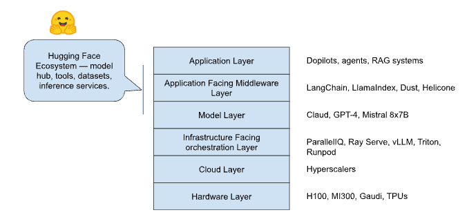 In the broader architecture, Hugging Face occupies a hybrid position between the model and middleware layers: