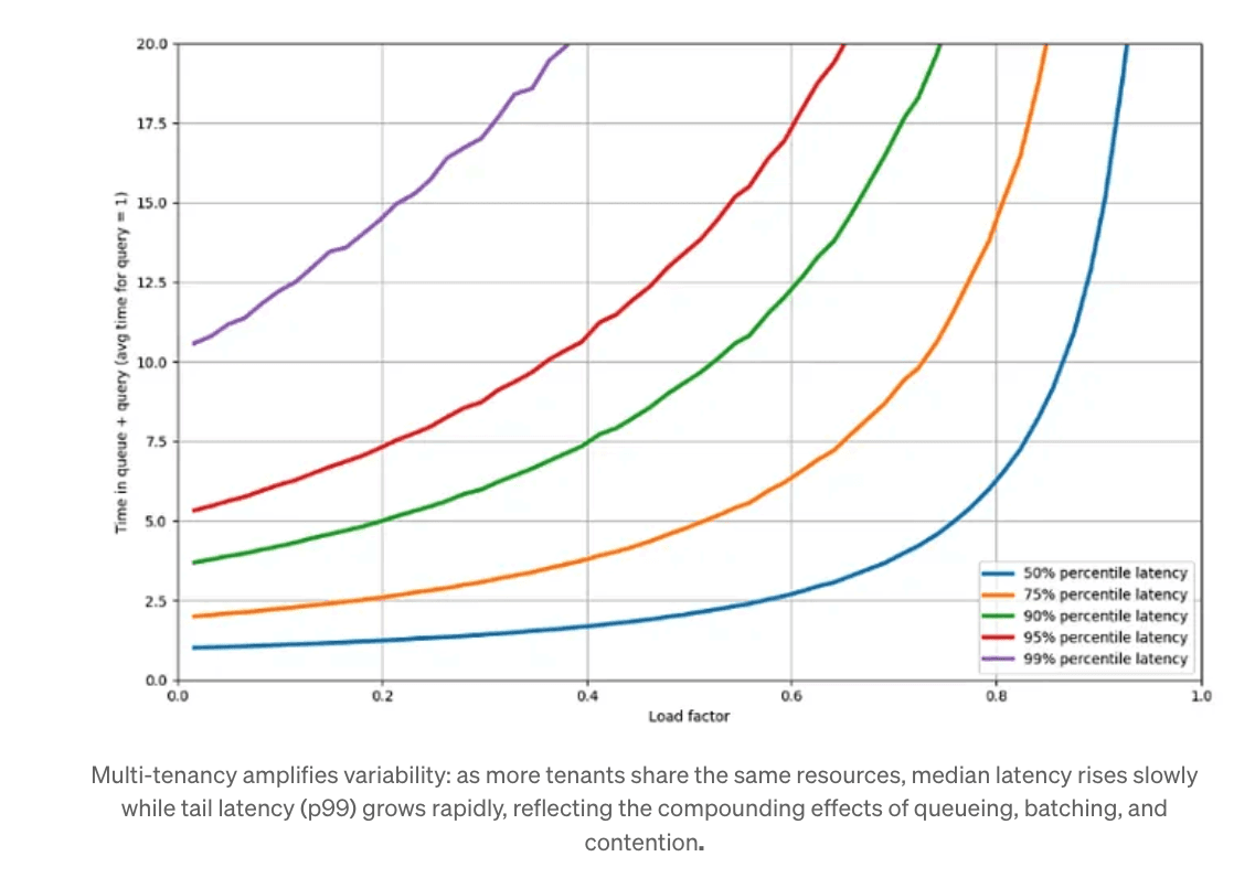 The result is a system where throughput remains high and average latency barely moves, even as p99 latency grows exponentially. This explains why two systems with identical GPUs and utilization can feel completely different under load.