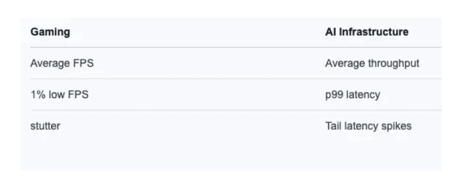 Two systems can have identical average FPS but wildly different 1% lows — and feel completely different to users. This maps directly to infrastructure: